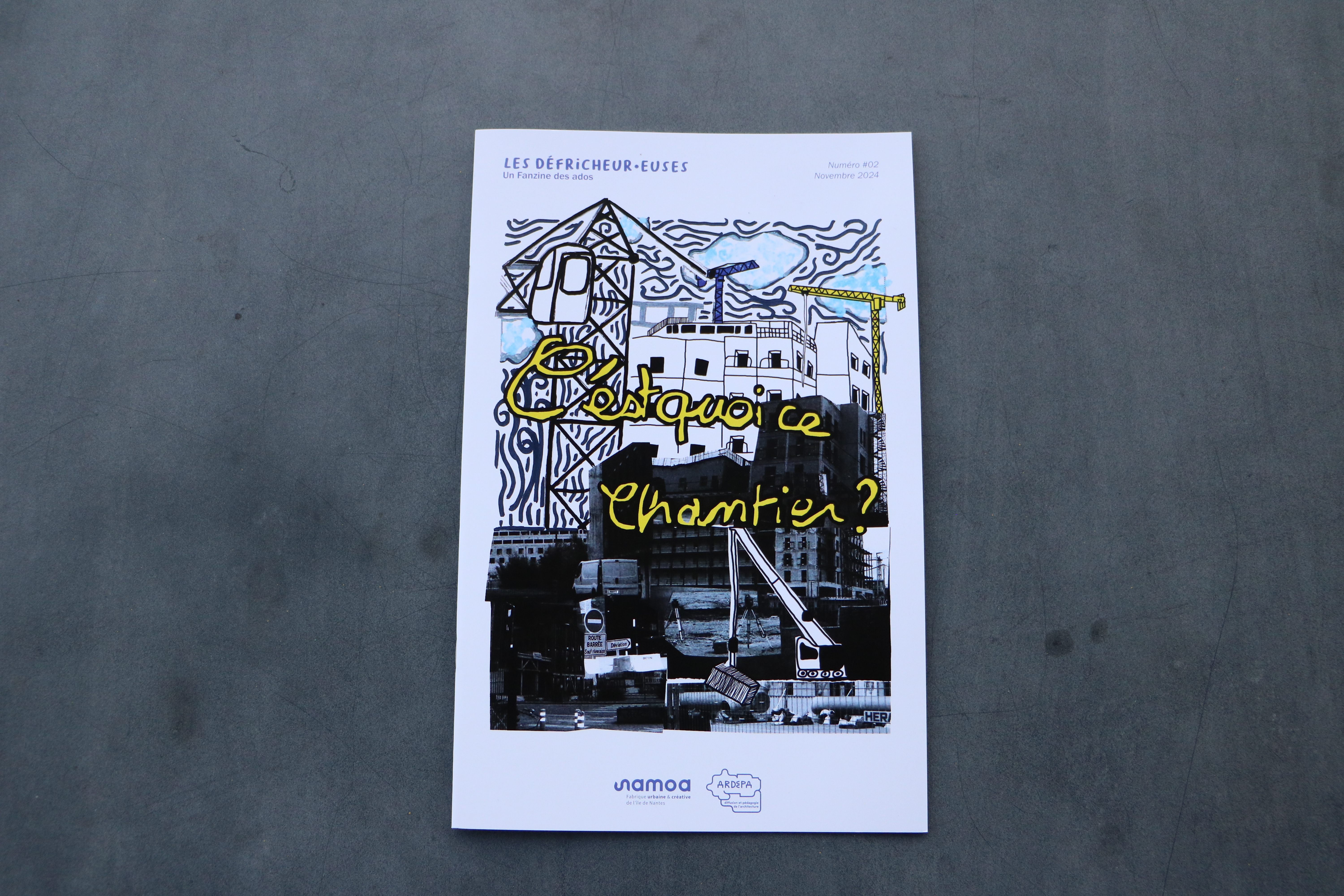 Lors du second cycle d’Archi’teliers de l’année 2025, un groupe d’architectes en herbe est parti à la découverte d’un monde souvent caché derrière des palissades : celui du chantier, en plein cœur de la transformation urbaine de l’île de Nantes. Ils ont produit un fanzine dans lequel ils partagent leurs découvertes avec humour et engagement.