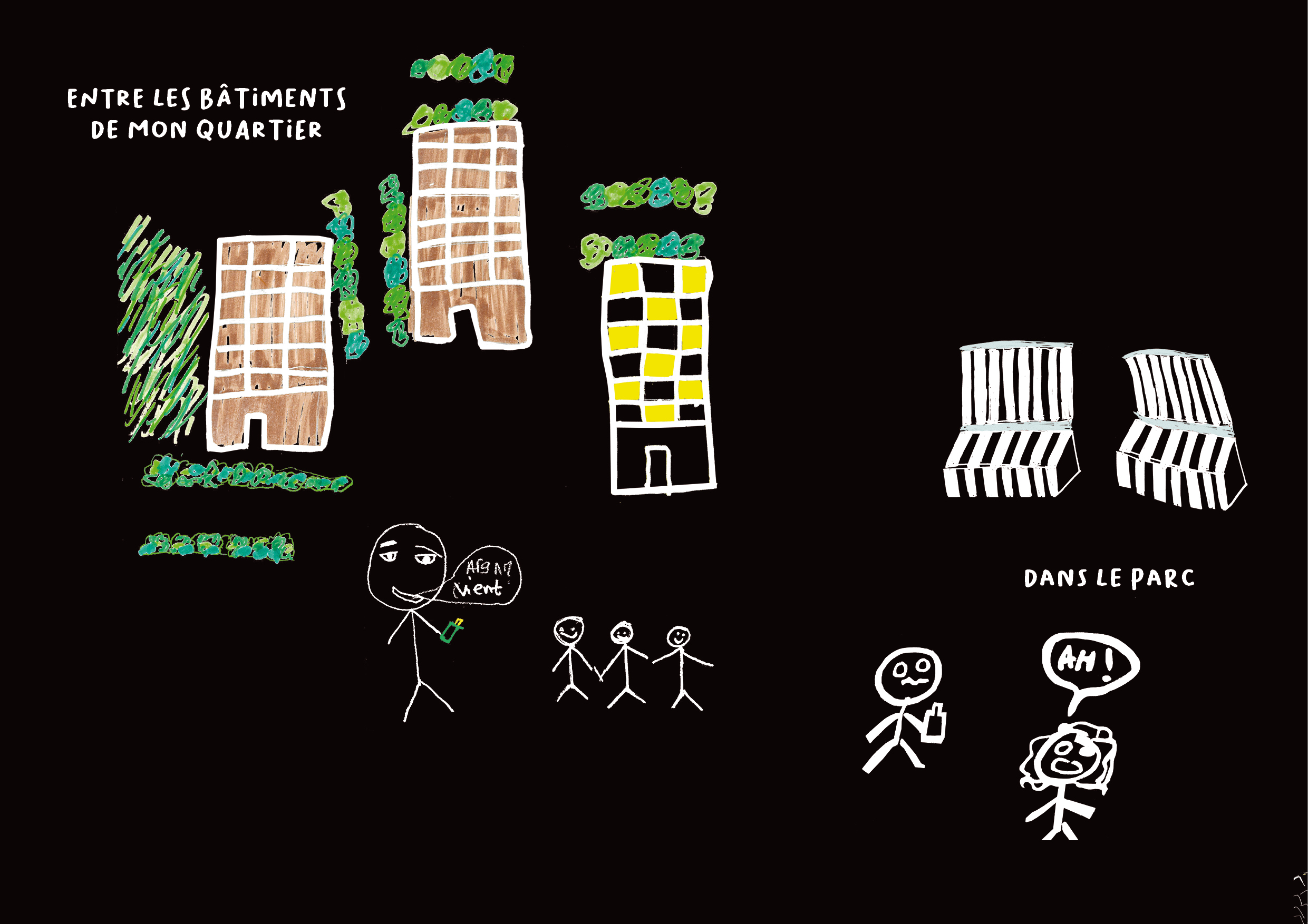 - Une projection des dessins sous la forme de « mapping » : Mise en commun et projection des dessins des participant·es dans l’espace public, la nuit. Ce temps de partage était l’occasion de mettre en lumière les similitudes mais aussi les contrastes qui existent entre leurs différentes observations et ressentis concernant les deux quartiers étudiés.