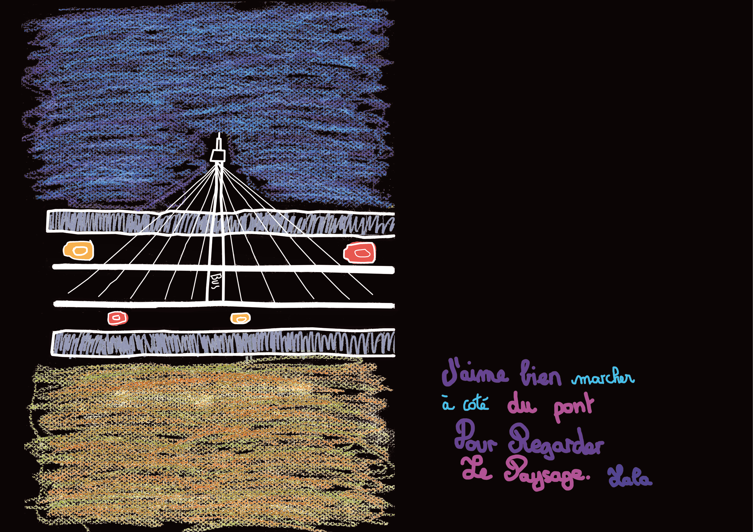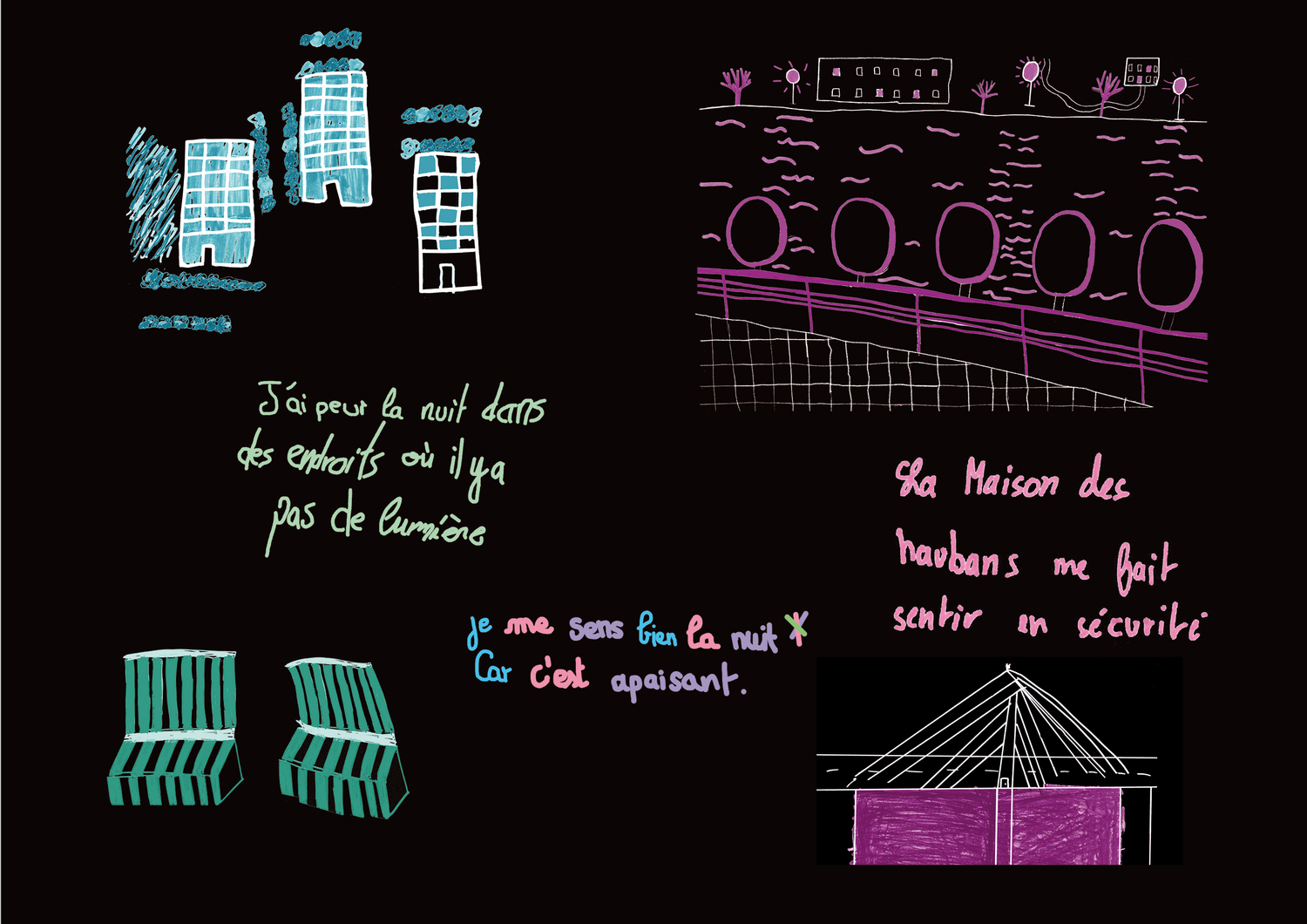 - Une séance de représentation par le dessin : les participant·es étaient invités à illustrer les observations faites lors de l’atelier précédent. Les lieux appréciés, les trajets empruntés, les choses qui rassurent ou au contraire les choses qui inquiètent la nuit ont ainsi été représentées.