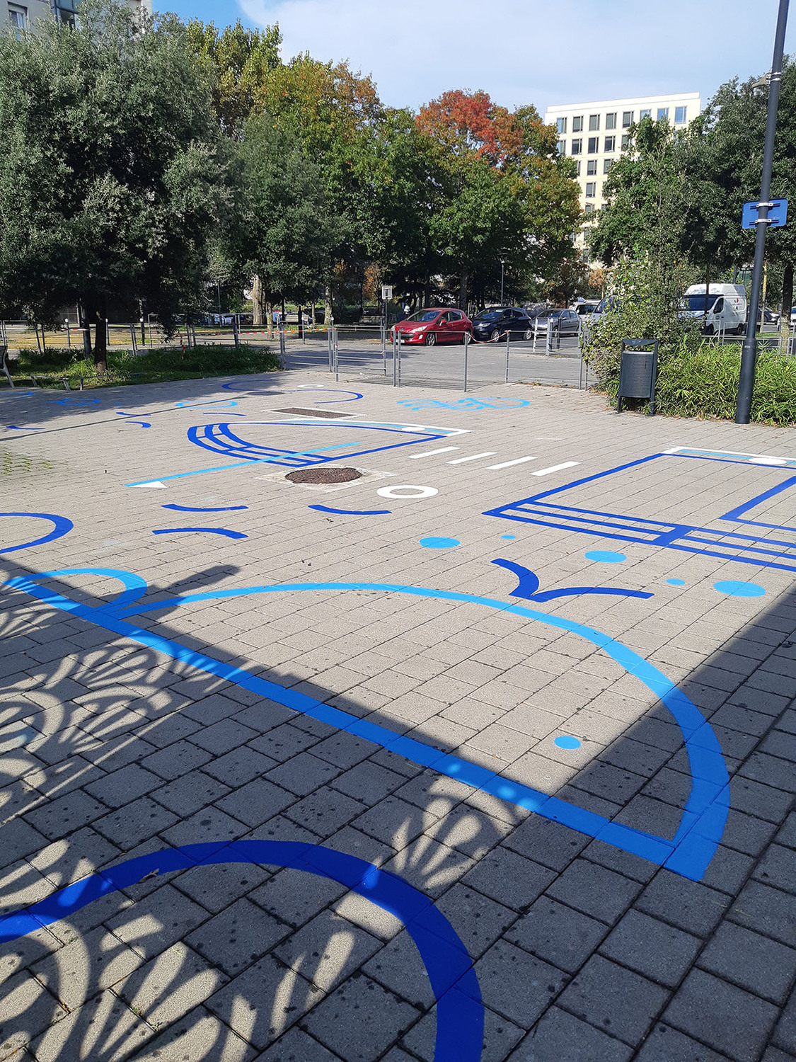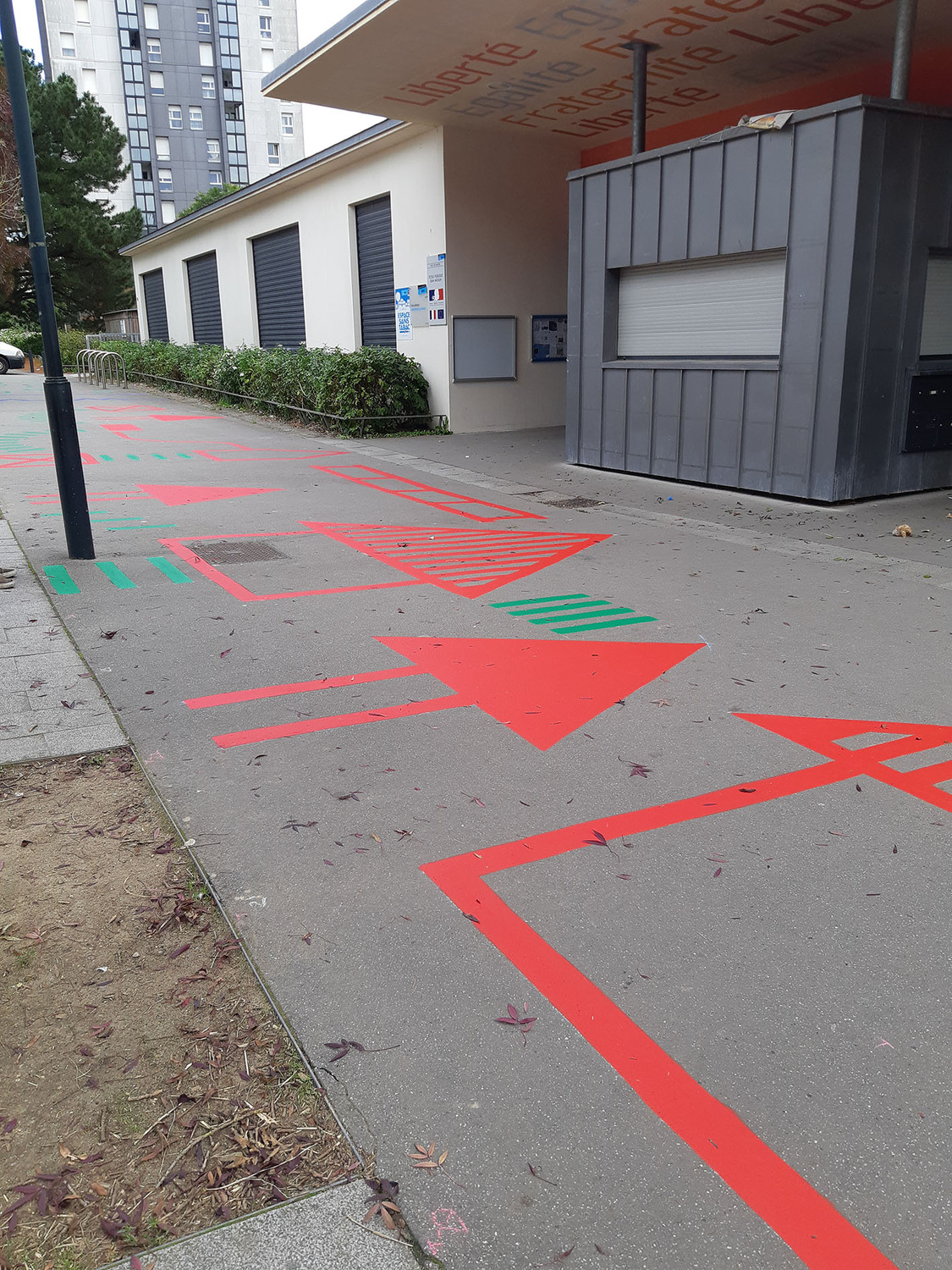 Tracer au sol le bateau pirate et le château rouge pour rappeler l’histoire de ces anciennes aires de jeux, tout en laissant place à la création de nouveaux souvenirs, tels étaient les objectifs de ces propositions. Les fresques font références aux anciennes structures à bien des égards : le choix des couleur, les formes géométriques et leurs emplacements.