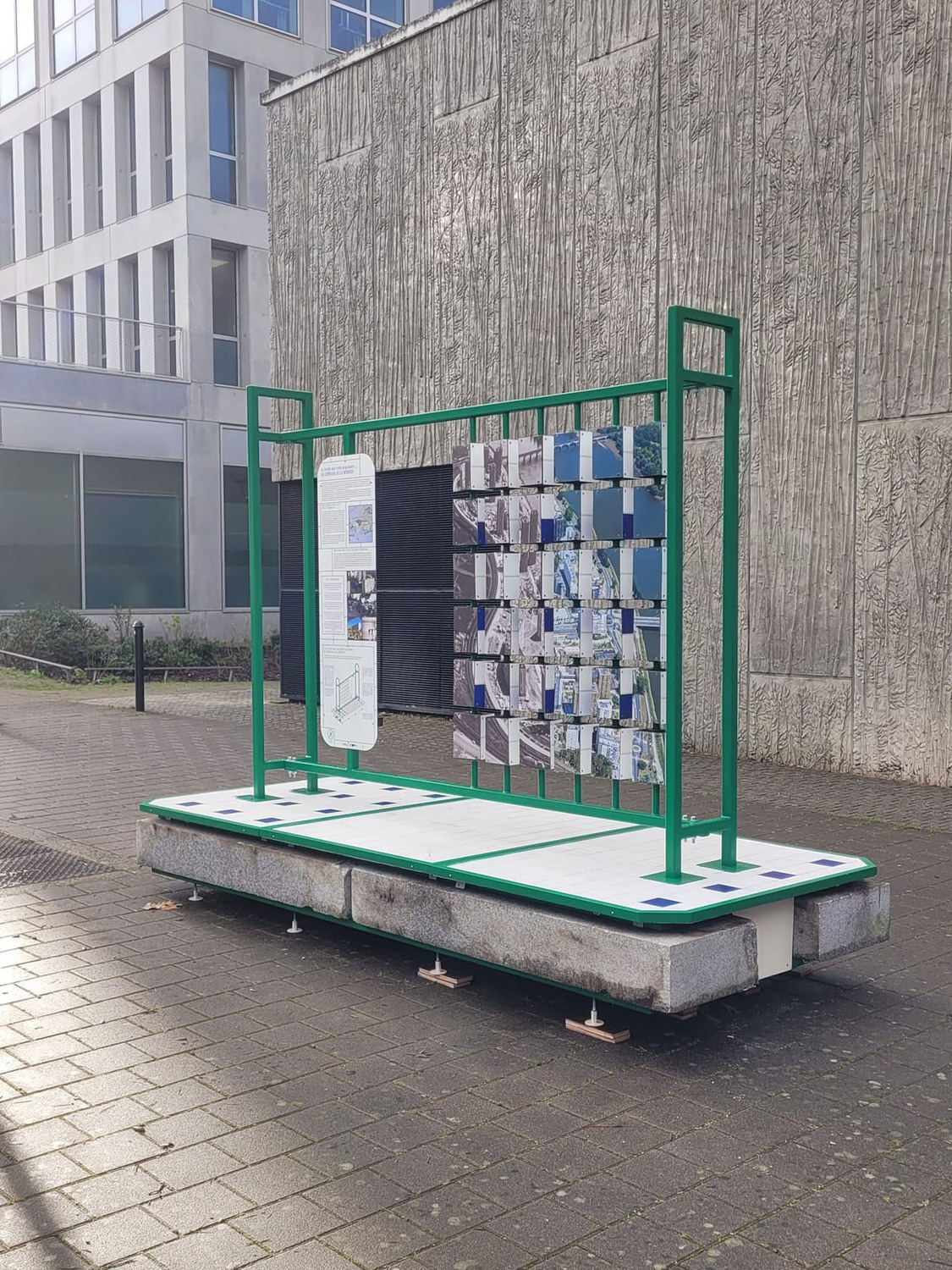 Faisant le constat que la place Rosa Parks était certainement celle qui était la plus difficile à reconstituer avant travaux, nous souhaitions que cette proposition donne des clés de lecture pour une meilleure compréhension des changements. C’est pourquoi des blocs rotatifs reprenent la trame murale des anciens halls et dessinent 3 possibilités de composition : une vue aérienne du quartier avant le grand projet de ville ; une vue aérienne du quartier après le grand projet de ville ; le dessin de la faïence sur les deux faces restantes.