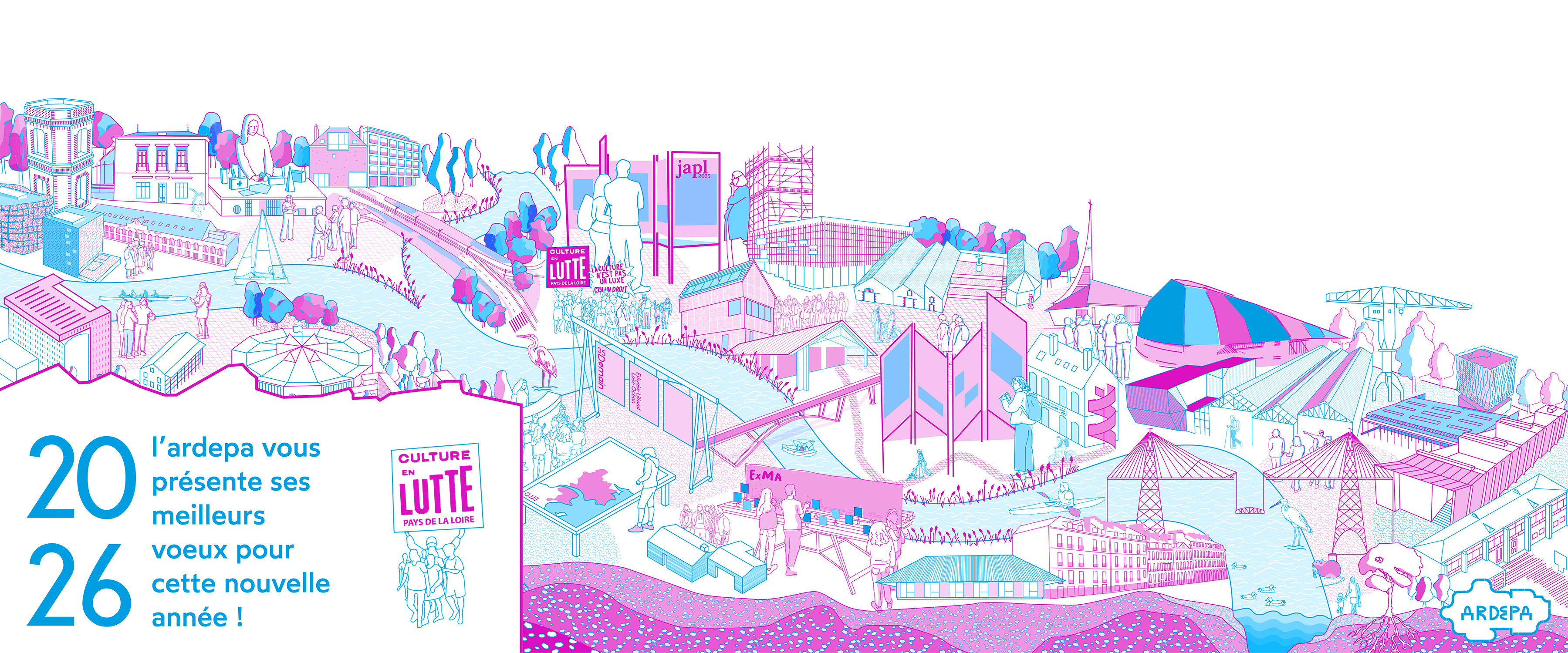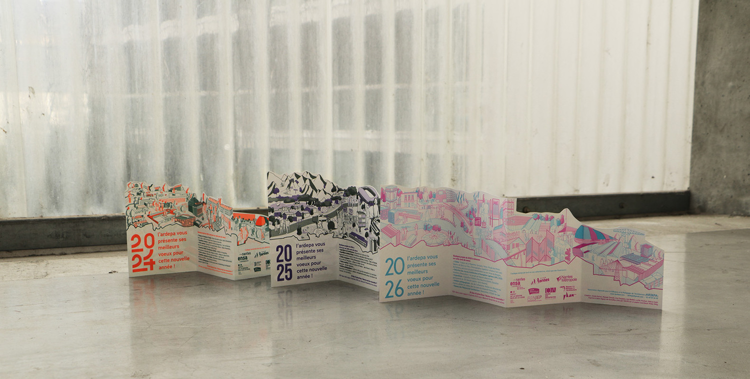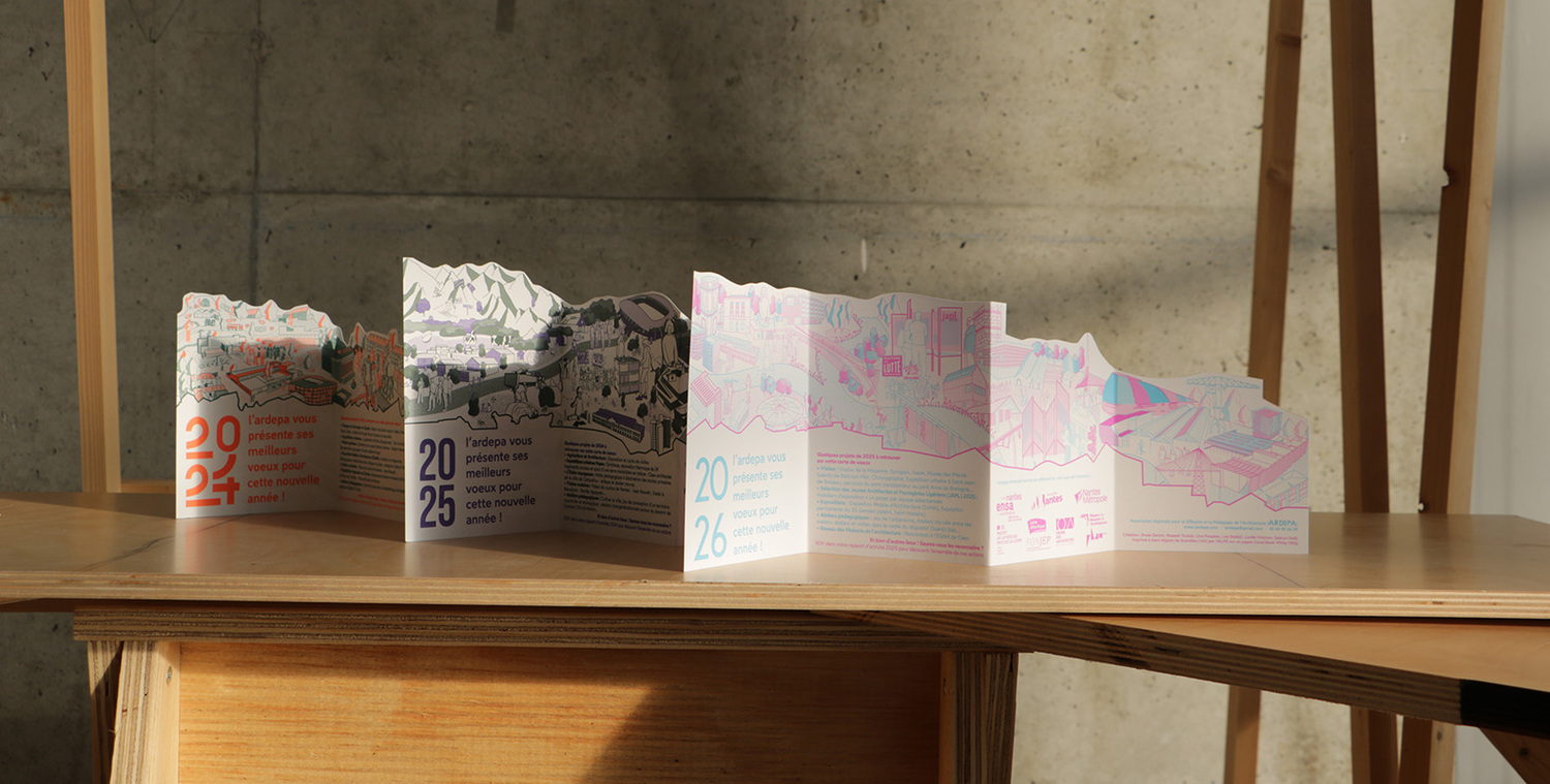 Nous poursuivons notre cycle de cartes de voeux en "leporello", initié fin 2023 : la carte rassemble de nombreux bâtiments et espaces publics visités par l’ardepa en 2025, les expositions sur lesquelles a travaillé l’association, des ateliers pédagogiques mennés avec des classes... Saurez-vous reconnaitre tous ces lieux et tous ces projets ?