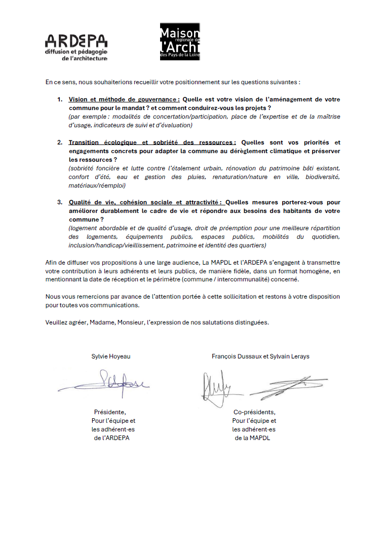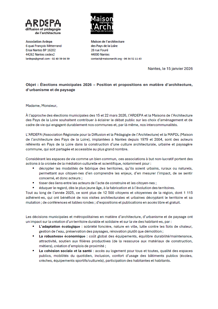À l’occasion des élections municipales 2026, l’ardepa et la Maison de l’Architecture des pays de la Loire (MAPDL) interpellent les équipes candidates dans les grandes communes des Pays de la Loire, pour recueillir leurs positions et leur propositions sur les choix d’aménagement et de cadre de vie qui engagent durablement nos communes et par là même, nos intercommunalités.