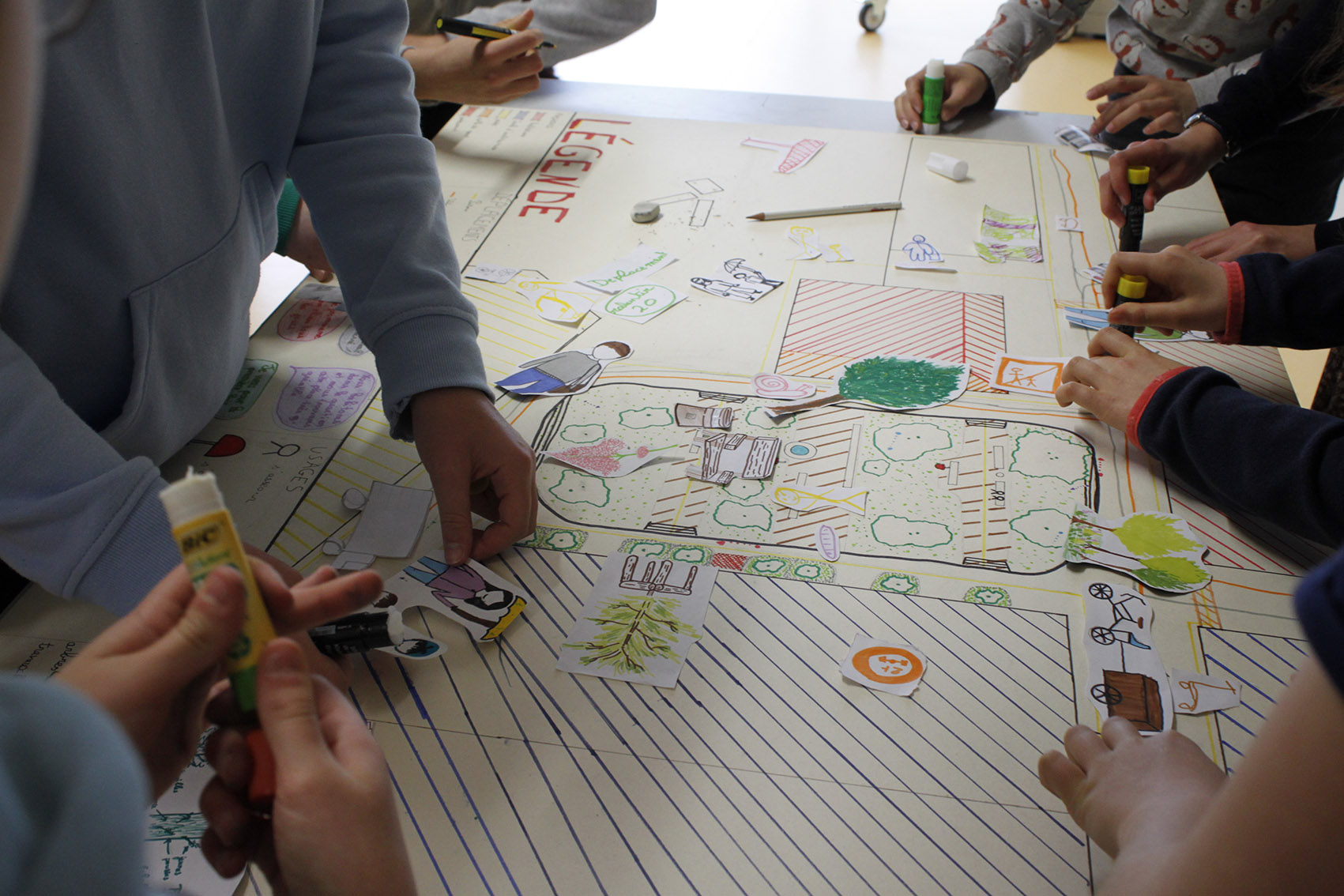 L’atelier commence en classe par un temps de réflexion collectif : qu’est-ce qu’un architecte ? Quels autres métiers imaginent la ville ? Qu’est-ce qu’un espace public ? Comment lit-on un plan ? Ces questions introduisent les notions essentielles de l’urbanisme et préparent les enfants à observer leur quartier avec un regard attentif et curieux.