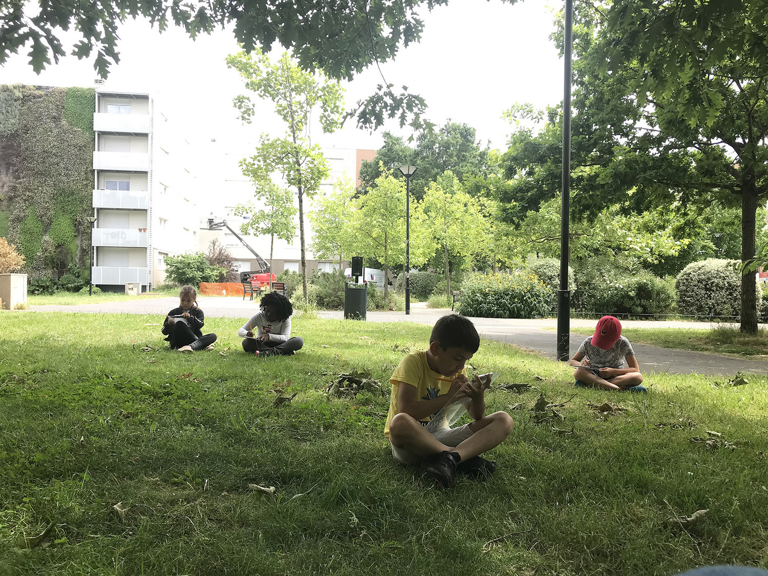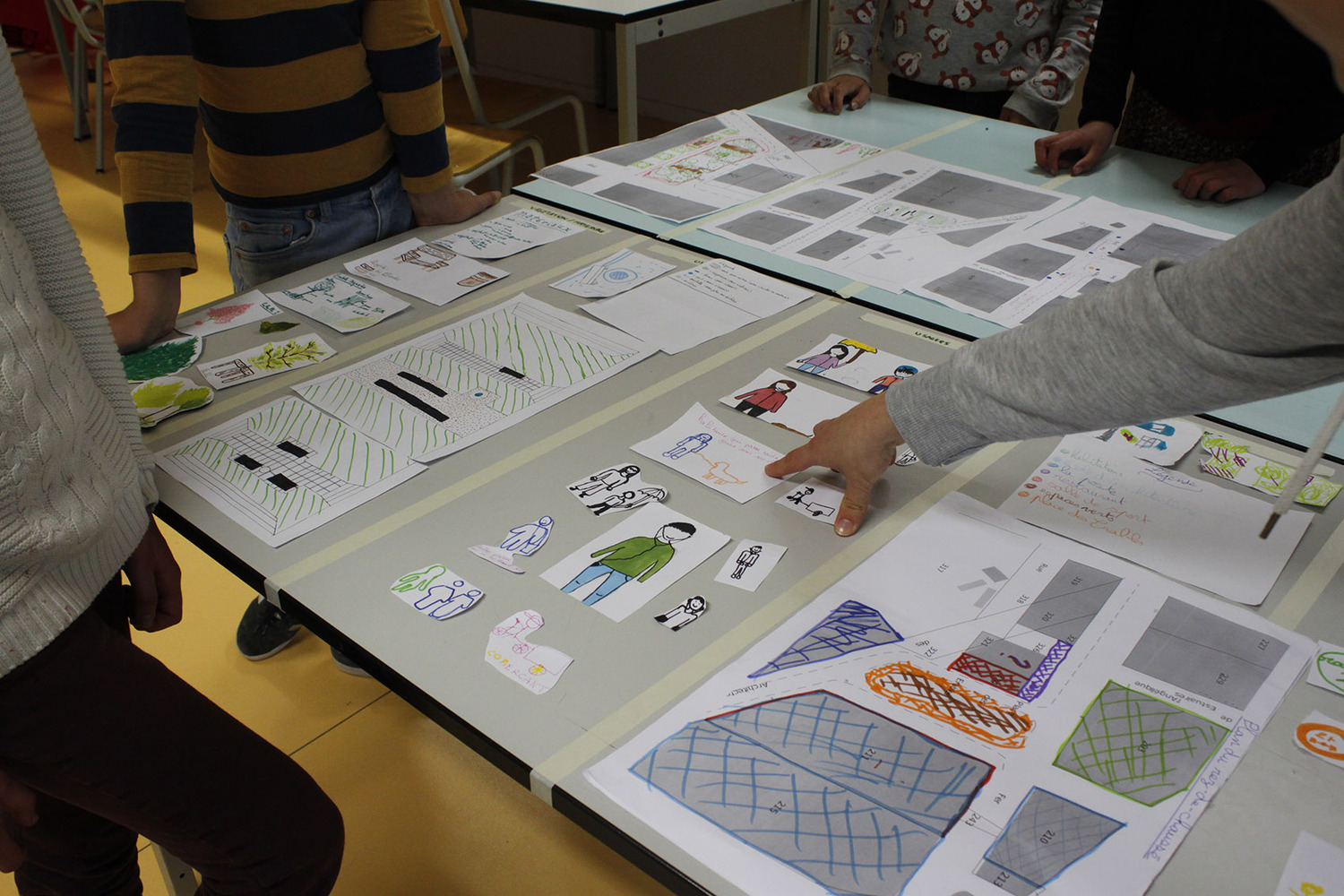 Lors de la séance suivante, les enfants partagent leurs découvertes et transforment leurs notes et croquis en cartographie sensible commune. Ensemble, ils sélectionnent la matière qu’ils estiment la plus pertinente. Une fois cette cartographie finalisée, ils réfléchissent aux manques ou aux dysfonctionnements de l’espace et commencent à imaginer des pistes pour les résoudre. Cette cartographie devient le point de départ de la création architecturale.