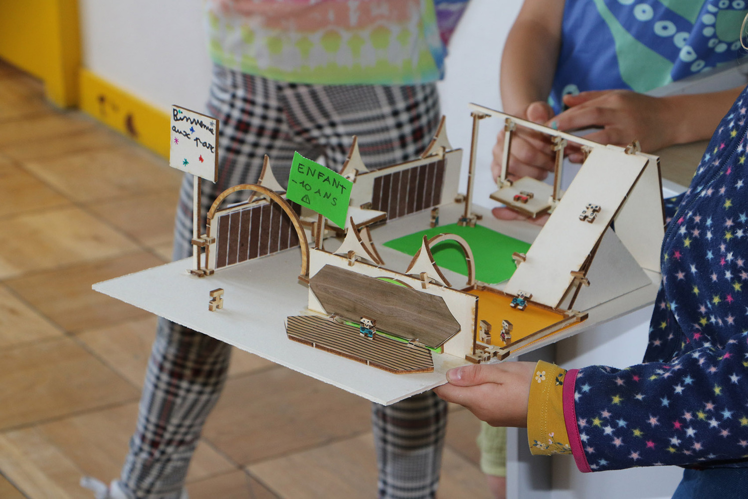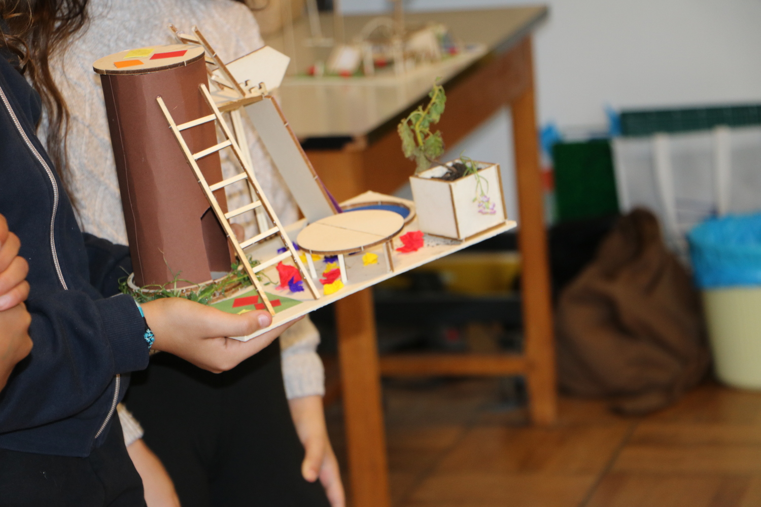 Dans les ateliers suivants, les élèves passent à la réalisation concrète : en petits groupes, ils conçoivent des projets sous forme de maquettes. Chaque groupe propose des petites installations urbaines qui explorent de nouveaux usages. Ces constructions permettent aux enfants de mettre en pratique leur créativité tout en travaillant en équipe et en expérimentant le processus de projet, comme de véritables architectes. Pour finir, les élèves présentent leurs projet à l’ensemble de la classe.