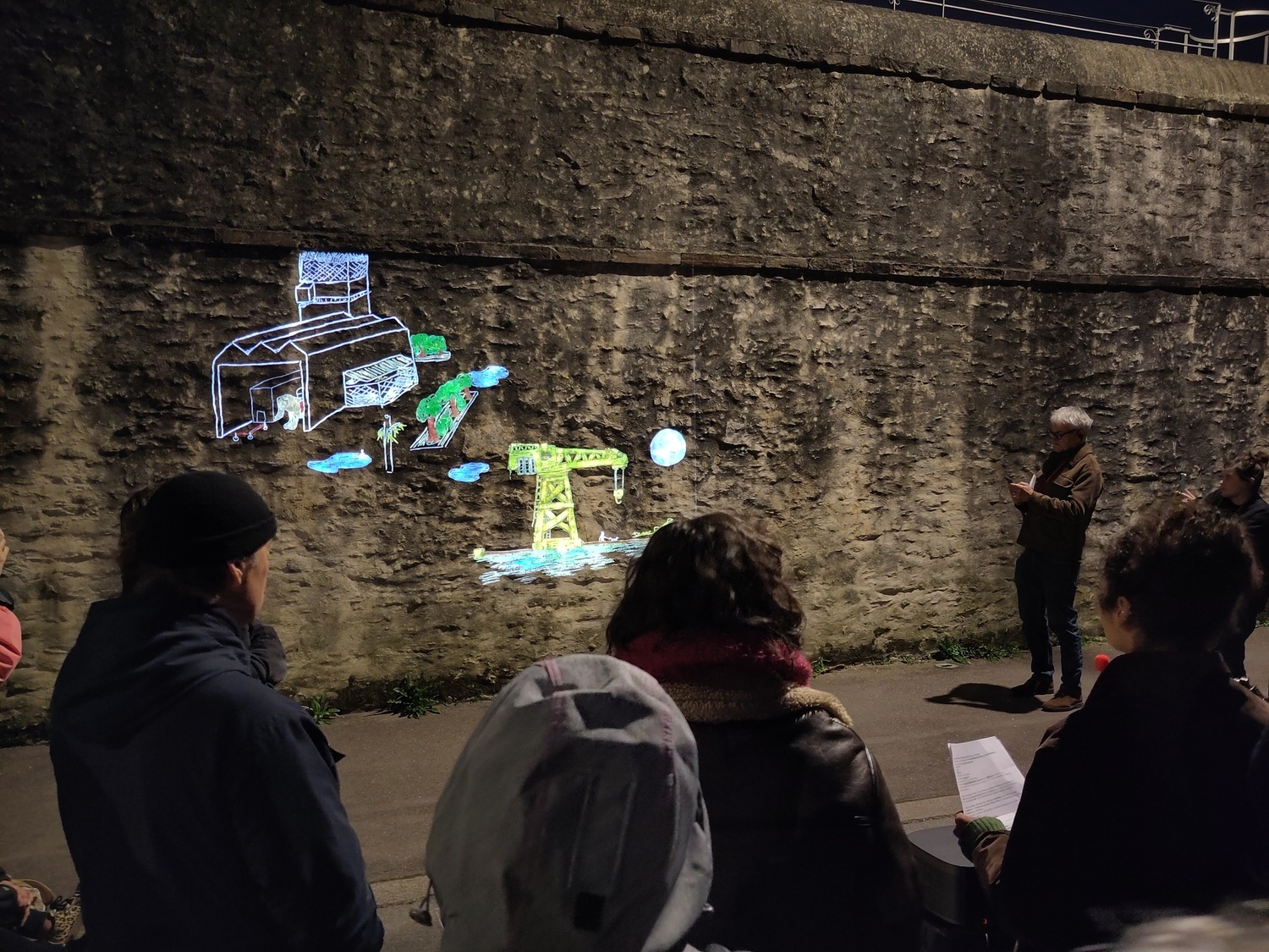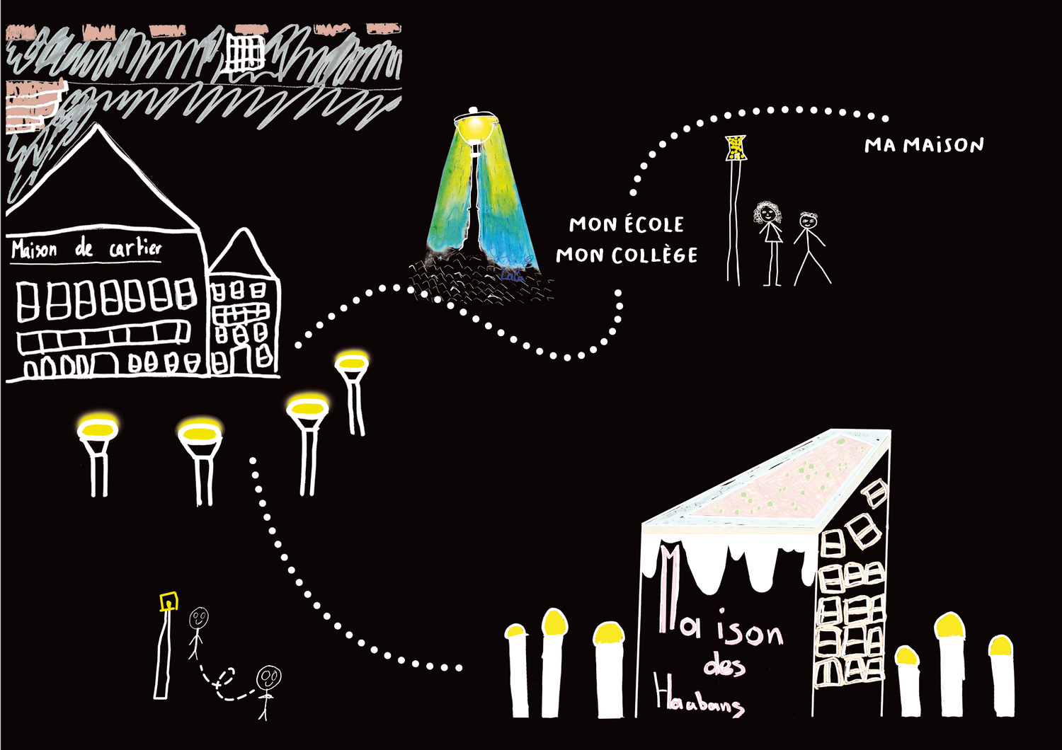 - Une projection des dessins sous la forme de « mapping » : Mise en commun et projection des dessins des participant·es dans l’espace public, la nuit. Ce temps de partage était l’occasion de mettre en lumière les similitudes mais aussi les contrastes qui existent entre leurs différentes observations et ressentis concernant les deux quartiers étudiés.