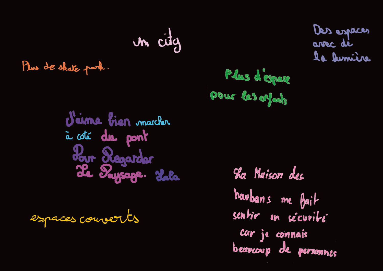 - Une séance de représentation par le dessin : les participant·es étaient invités à illustrer les observations faites lors de l’atelier précédent. Les lieux appréciés, les trajets empruntés, les choses qui rassurent ou au contraire les choses qui inquiètent la nuit ont ainsi été représentées.