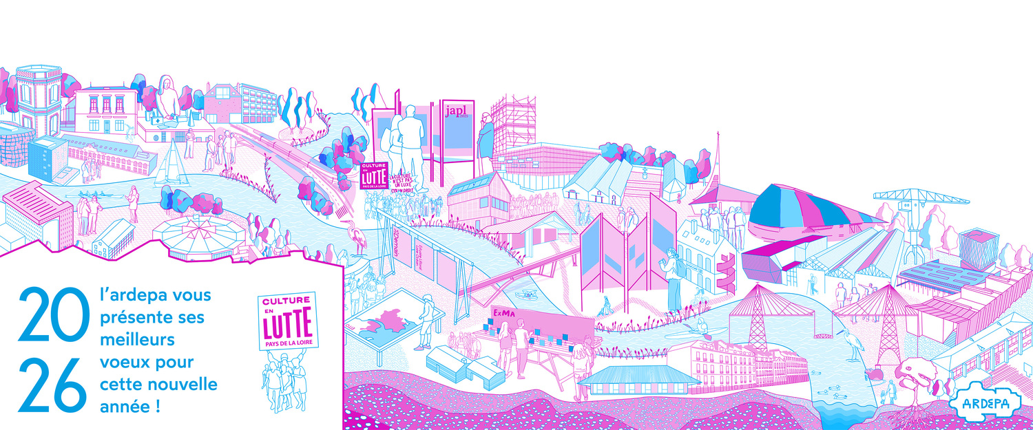 Nous poursuivons notre cycle de cartes de voeux en "leporello", initié fin 2023 : la carte rassemble de nombreux bâtiments et espaces publics visités par l’ardepa en 2025, les expositions sur lesquelles a travaillé l’association, des ateliers pédagogiques mennés avec des classes... Saurez-vous reconnaitre tous ces lieux et tous ces projets ?